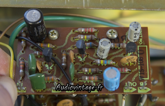 L’étage phono ou j’ai oublié de prendre une photo après intervention. Condensateurs et transistors neufs. Ce circuit est visible sur la photo « générale » du dessous de l’appareil.