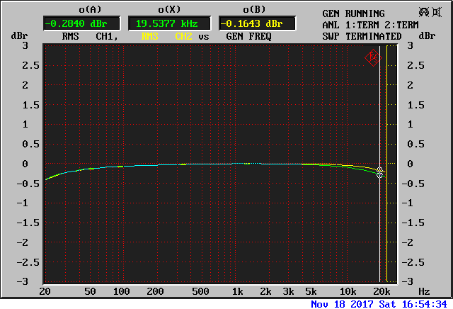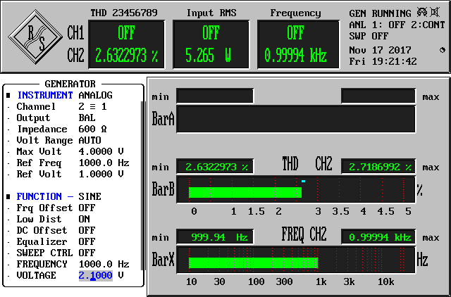 Passage au banc d’un des blocs, distorsion relevée à environ 5 watts sous 8 ohms.