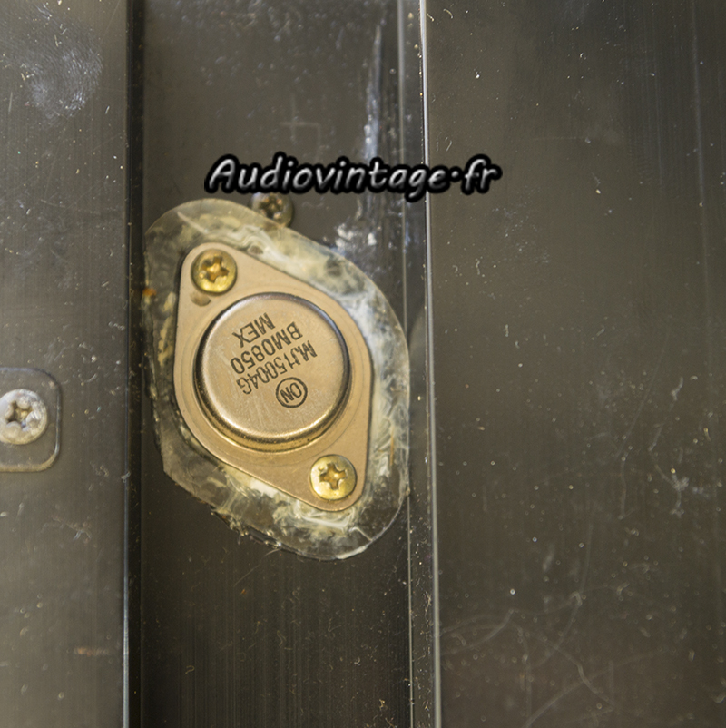 Les transistors de puissances. On y trouve un peu tout et n’importe quoi, des Onsemi probablement originaux associés à des merdouilles, parfois montés sur des micas « home made ». J’ai trouvé de la graisse lithium sous certains d’entre eux, rien de rien sous d’autres.
