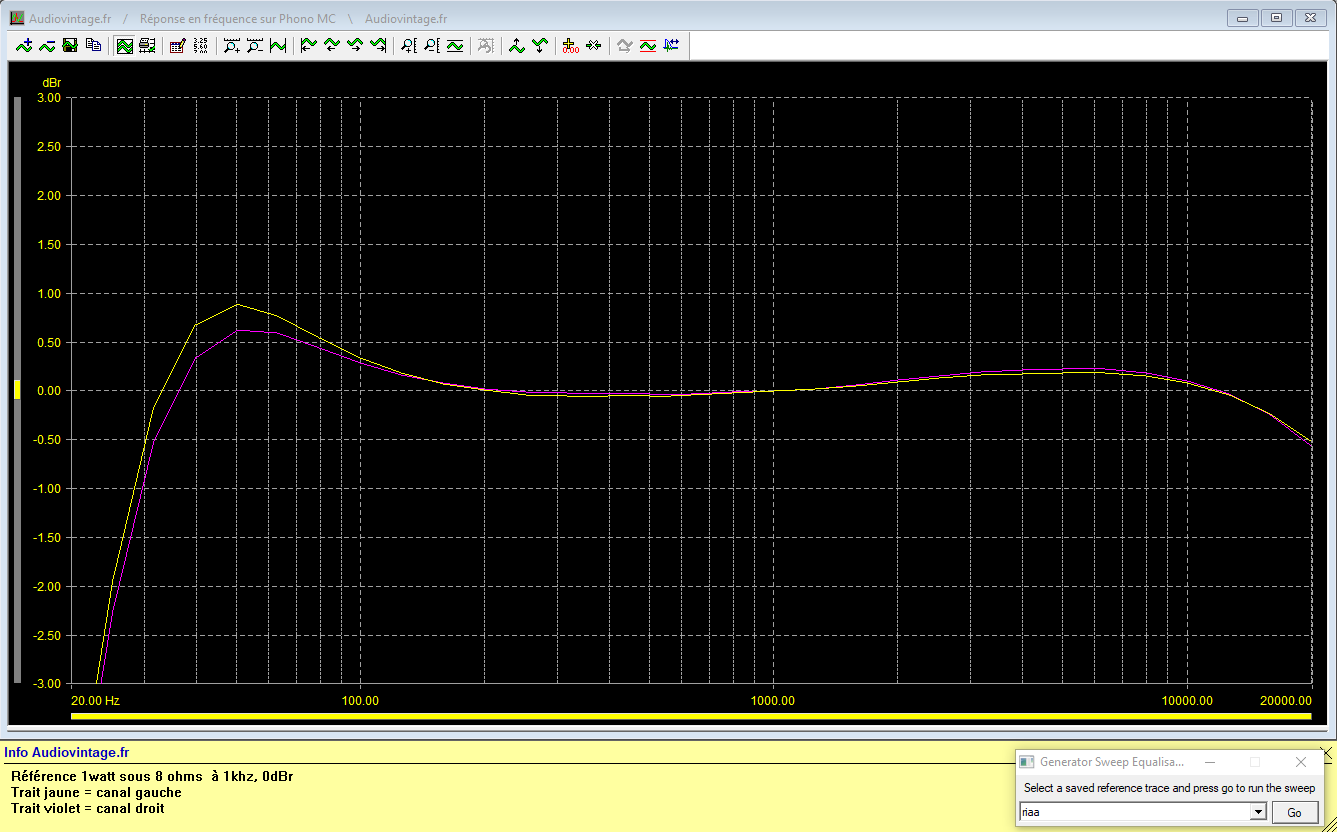 Réponse en fréquence à 2x1w sous 8 ohms, entrée phono MC, tone defeat.