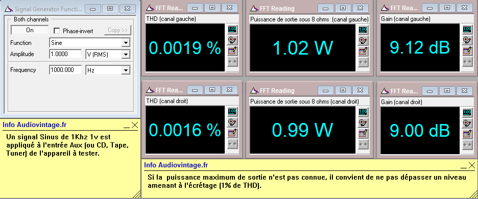 Signal carré à 100hz, 1khz, 10khz et temps de montée à 10khz. 1w en sortie sous 8 ohms, entrée aux, tone defeat.