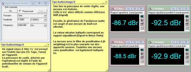 Rapport signal bruit à 2x1w sous 8 ohms, entrée aux, tone defeat.
