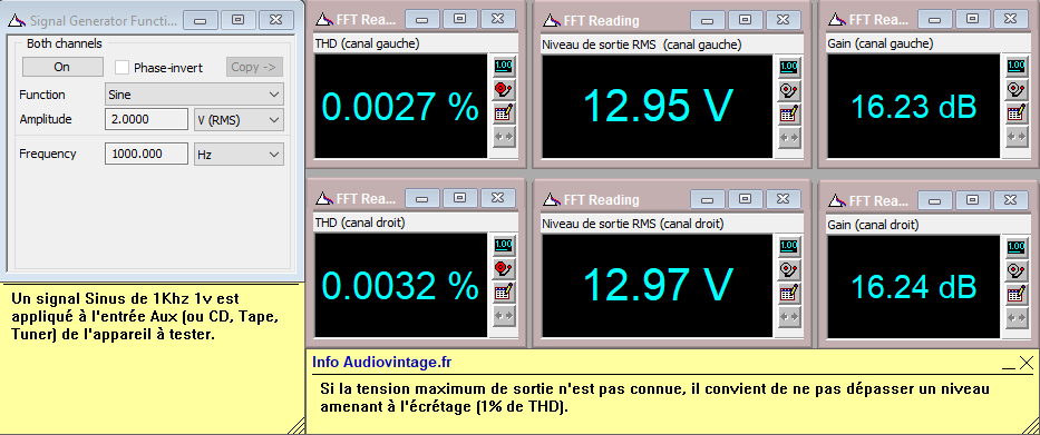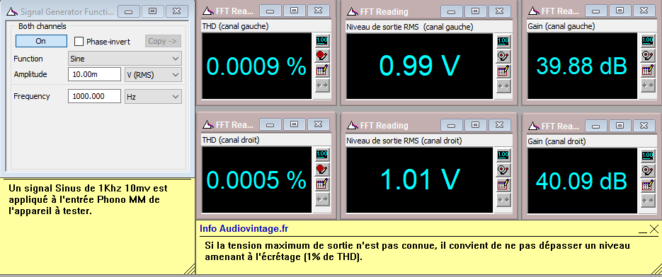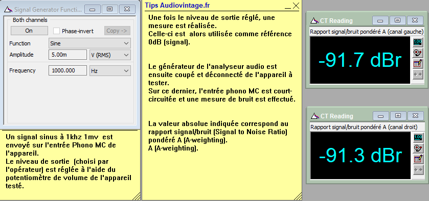 Rapport signal bruit à 13v en sortie, entrée phono MC, tone defeat.