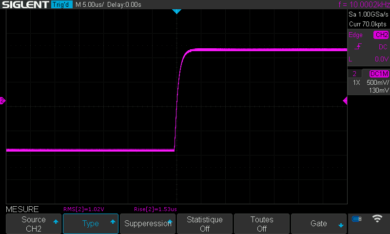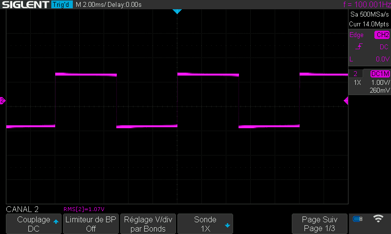 Signal carré à 100hz, 1khz, 10khz et temps de montée à 10khz. 1v en sortie, entrée CD.
