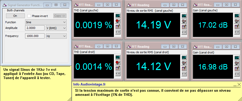 Rapport signal bruit à 14v en sortie, entrée aux, tone defeat.