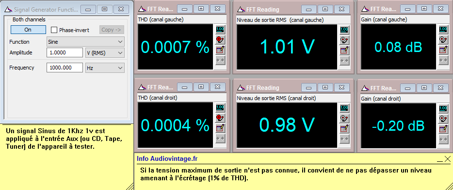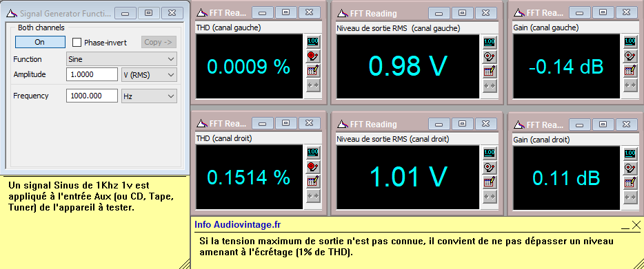 Ici, mesure de la distorsion en injectant un signal sur l’entrée aux, circuit de tonalité désactivé (defeat)