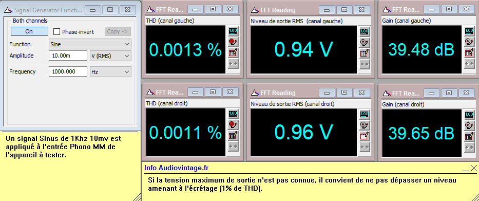 Rapport signal bruit à 1v en sortie, entrée phono, tone defeat.