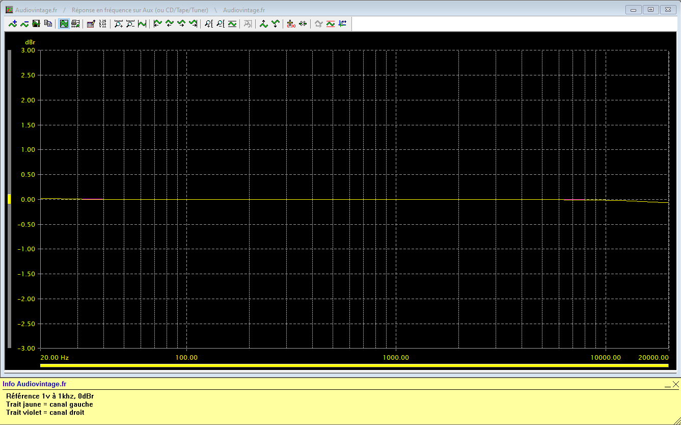 Réponse en fréquence à 1v en sortie, entrée phono, tone defeat.