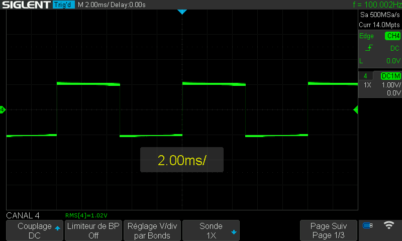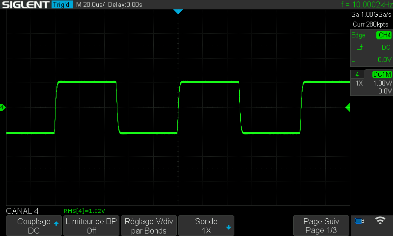 Signal carré à 100hz, 1khz, 10khz et temps de montée à 10khz. 1v en sortie, entrée aux, tone defeat.
