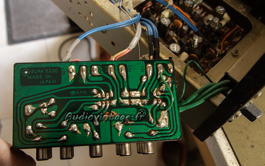 Je me suis ensuite rendu compte d’une perte de son sur un canal de l’entrée aux 2 et sur l’entrée phono. Retrait du circuit supportant le sélecteur de source pour nettoyage et surtout, réfection de soudures dont certaines étaient HS.