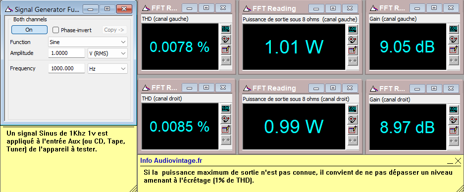 Signal carré à 100hz, 1khz, 10khz et temps de montée à 10khz. 1w en sortie sous 8 ohms, entrée aux, tone defeat.