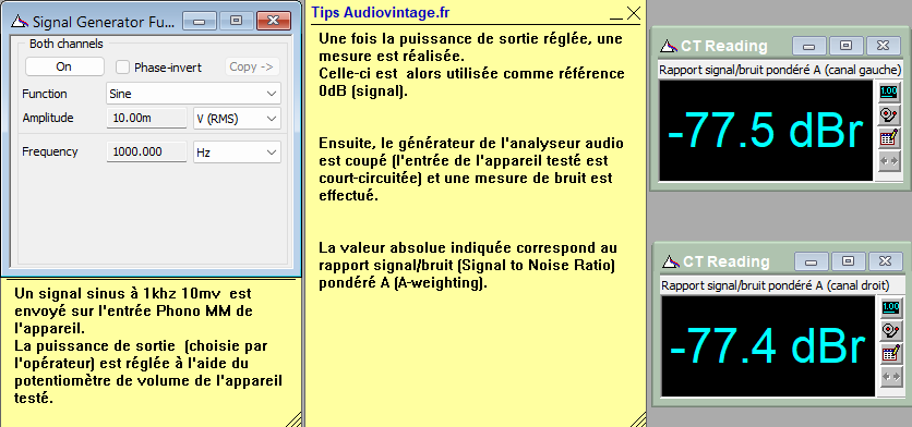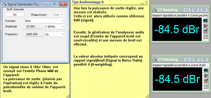 Rapport signal bruit à 2x1w sous 8 ohms, entrée phono.
