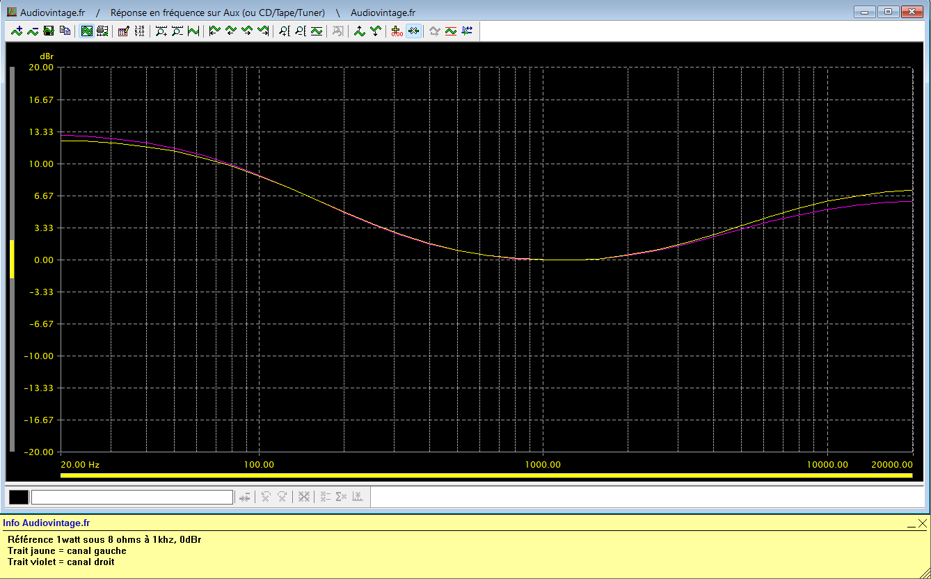 Réponse en fréquence à 2x1w sous 8 ohms, entrée aux, correcteurs au mini puis au maxi.