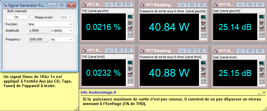 Signal carré à 100hz, 1khz, 10khz et temps de montée à 10khz. 1w en sortie sous 8 ohms, entrée aux, tone defeat.