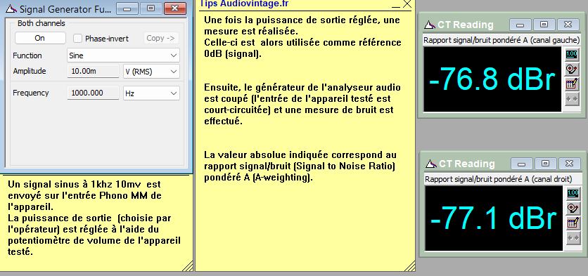 Rapport signal bruit à 2x1w sous 8 ohms, entrée phono, tone defeat.