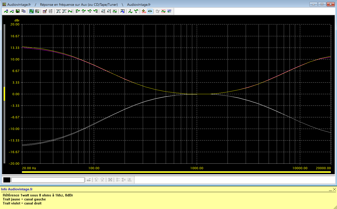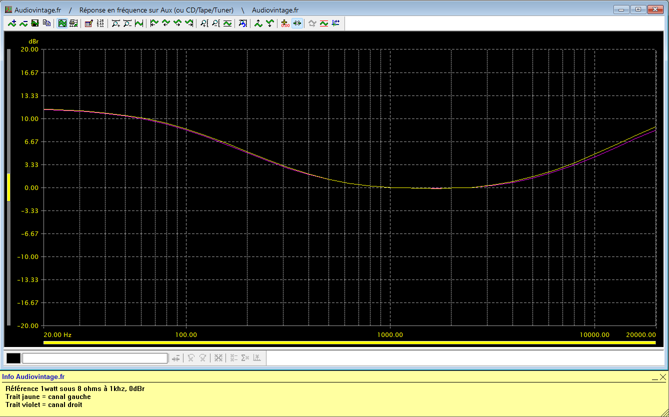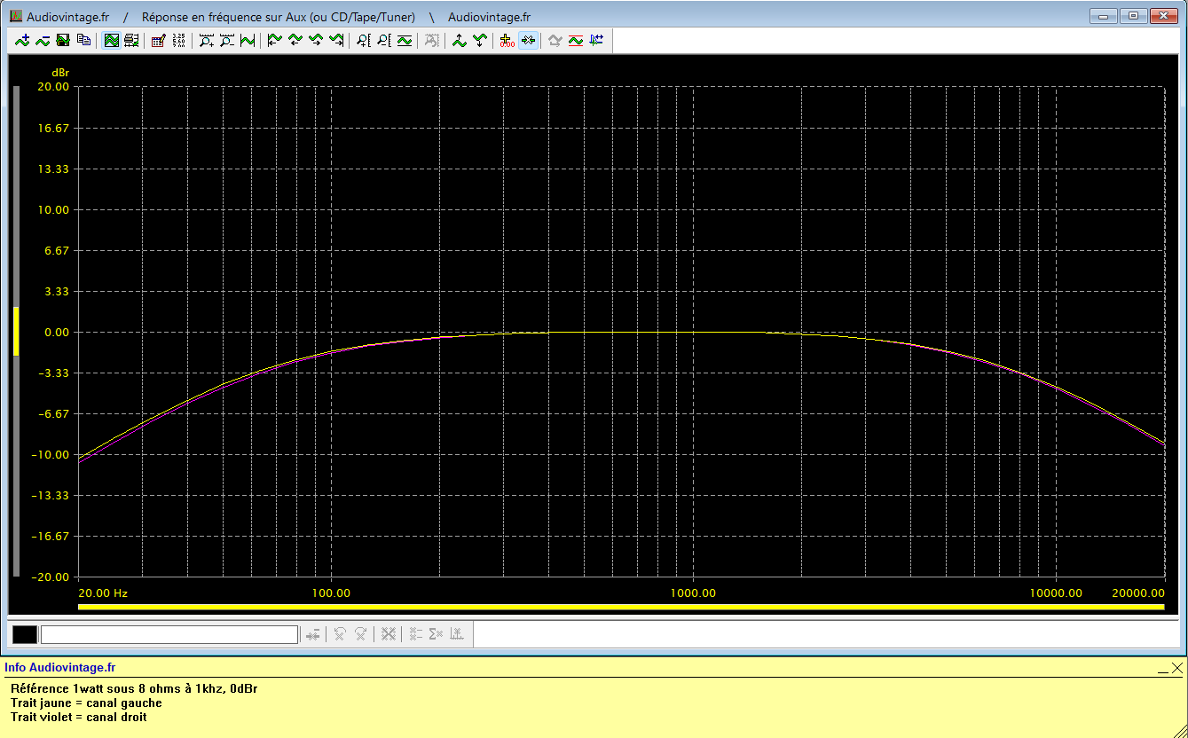 Réponse en fréquence à 2x1w sous 8 ohms, entrée phono, tone defeat.