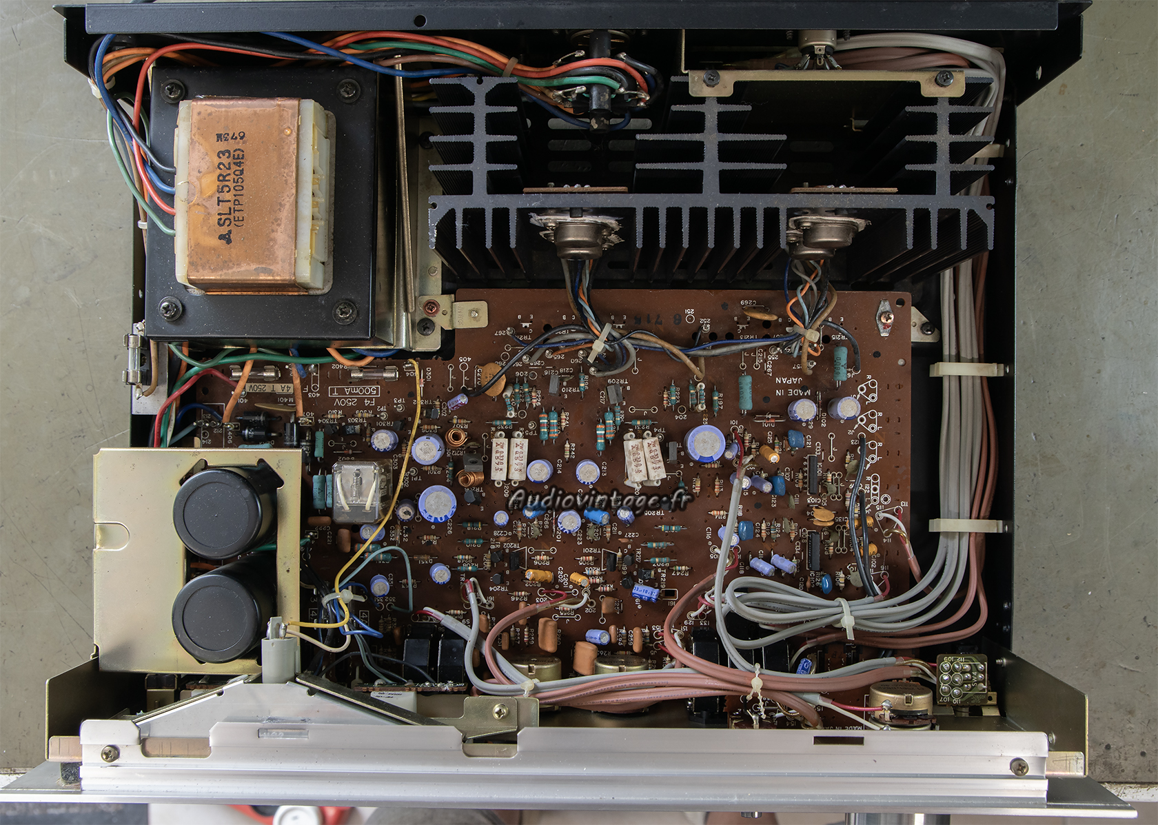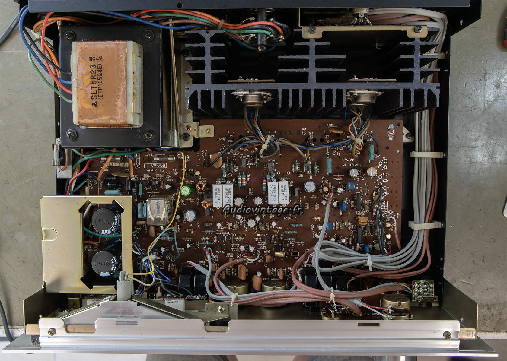 Condensateurs chimiques remplacés, tout comme les résistances d’émetteurs (sujet sensible sur ce modèle) et quelques transistors.