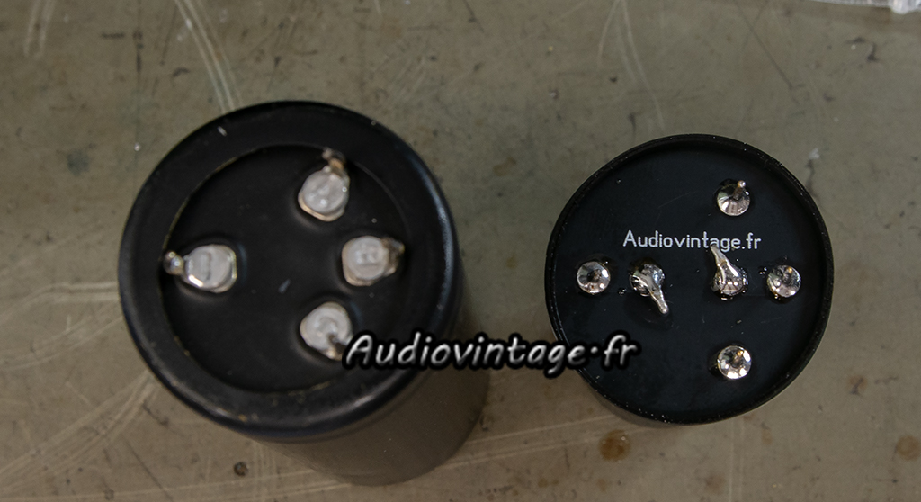 Les condensateurs de filtrage au format de fixation particulier à quatre broches vont être remplacés par des condensateurs au pas standard de 10mm montés sur mes adaptateurs.