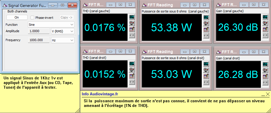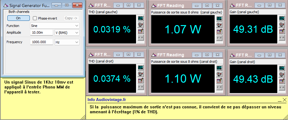 Signal carré à 100hz, 1khz, 10khz et temps de montée à 10khz. 1w en sortie sous 8 ohms, entrée aux, tone defeat.
