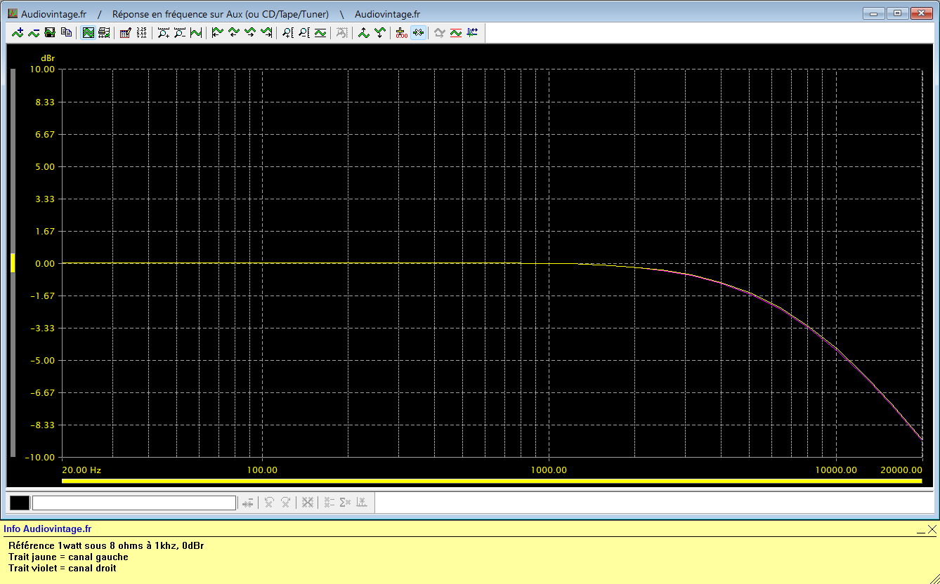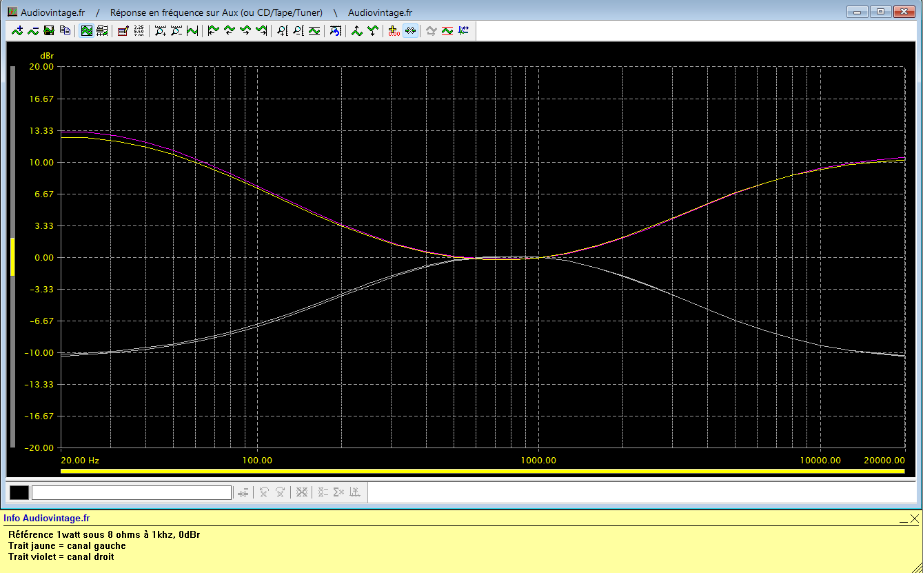 Réponse en fréquence à 2x1w sous 8 ohms, entrée aux, correcteurs au mini puis au maxi.