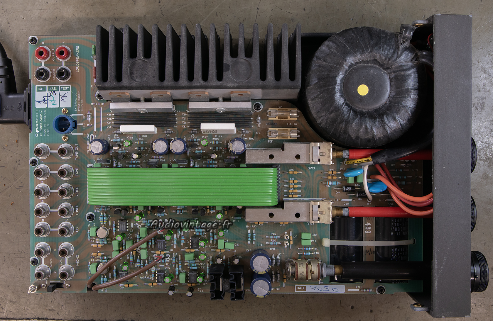 Pas de gros soucis pour cet exemplaire, qui ne souffre que des traditionnels condensateurs chimiques au bout du rouleau ainsi des problèmes récurrents de soudures sur la connectique rca et des commandes encrassées.