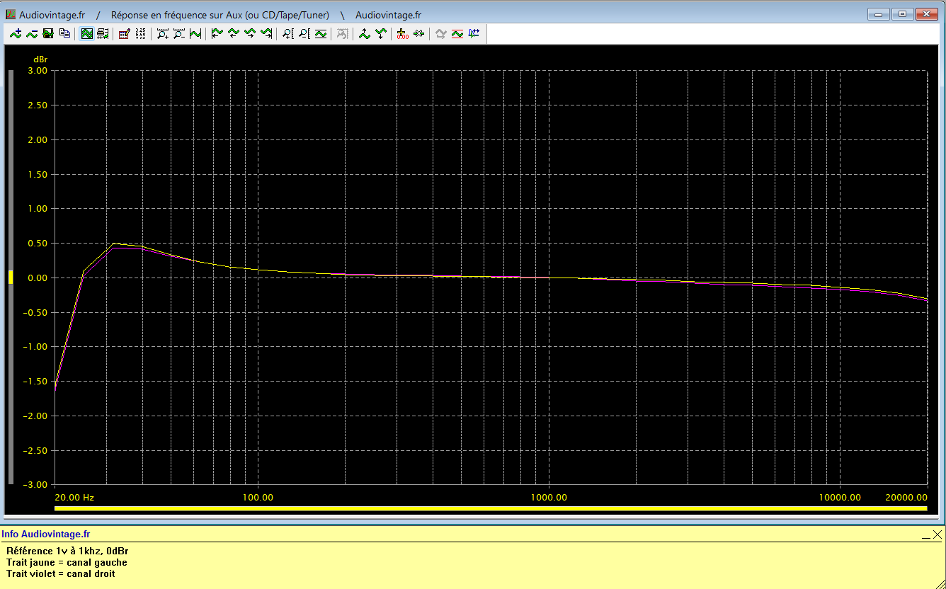 Réponse en fréquence à 1v en sortie, entrée tuner, correcteurs au mini puis au maxi.