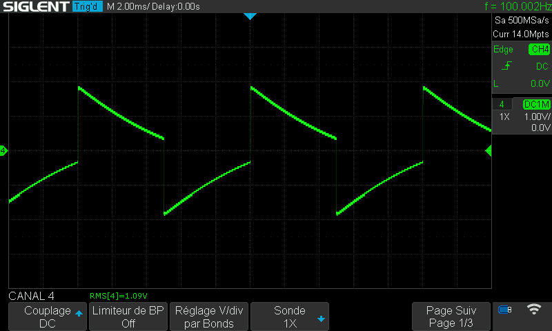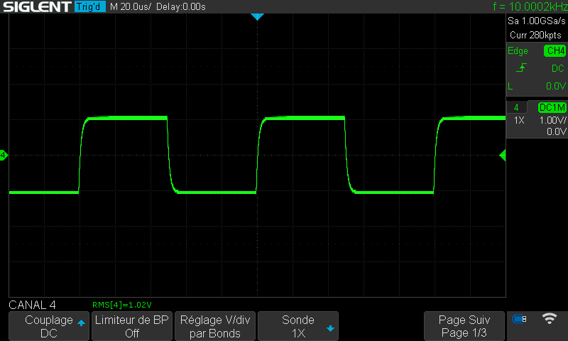 Signal carré à 100hz, 1khz, 10khz et temps de montée à 10khz. 1v en sortie, entrée tuner.