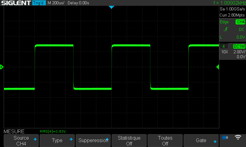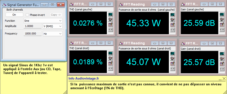 Signal carré à 100hz, 1khz, 10khz et temps de montée à 10khz. 1w en sortie sous 8 ohms, entrée aux, tone defeat.