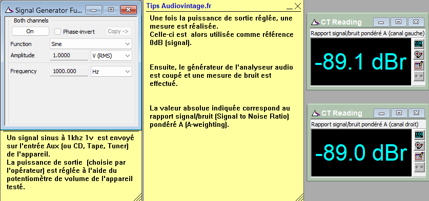 Rapport signal bruit à 2x1w sous 8 ohms, entrée aux, tone defeat.