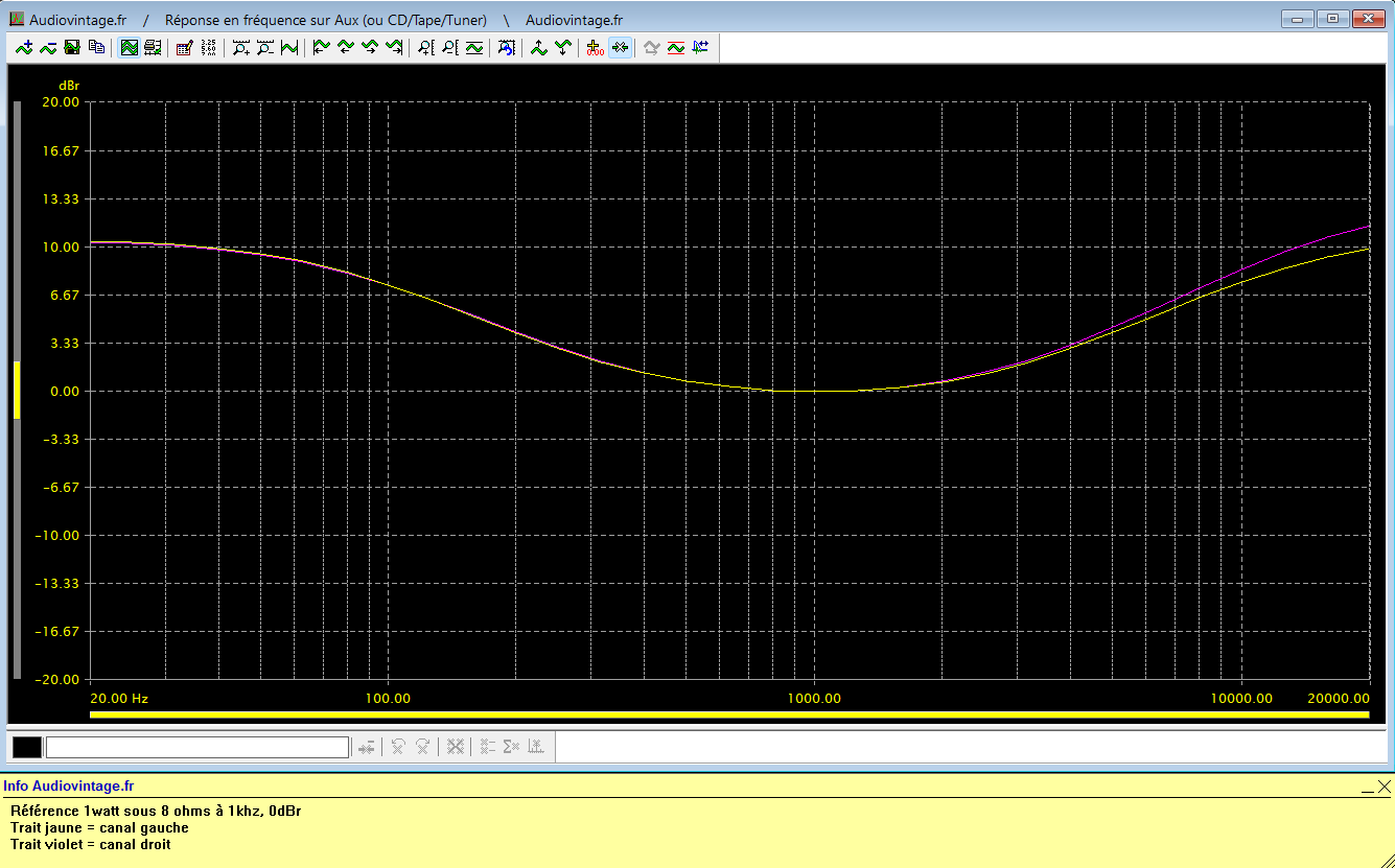Réponse en fréquence à 2x1w sous 8 ohms, entrée aux, correcteurs de tonalité au mini puis au maxi.