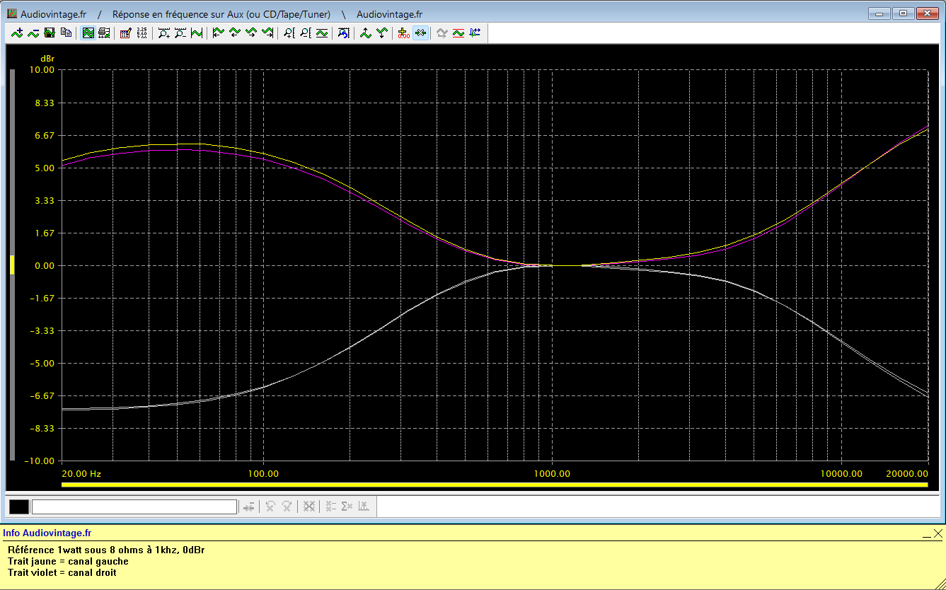 Réponse en fréquence à 2x1w sous 8 ohms, entrée aux, tone defeat.