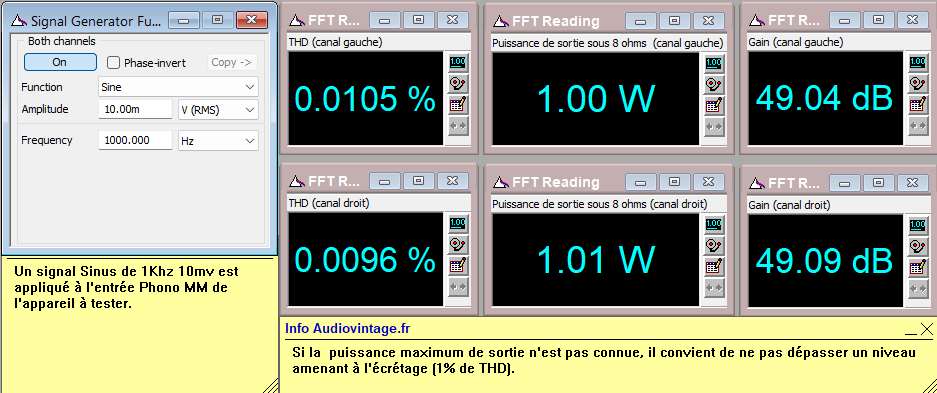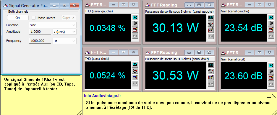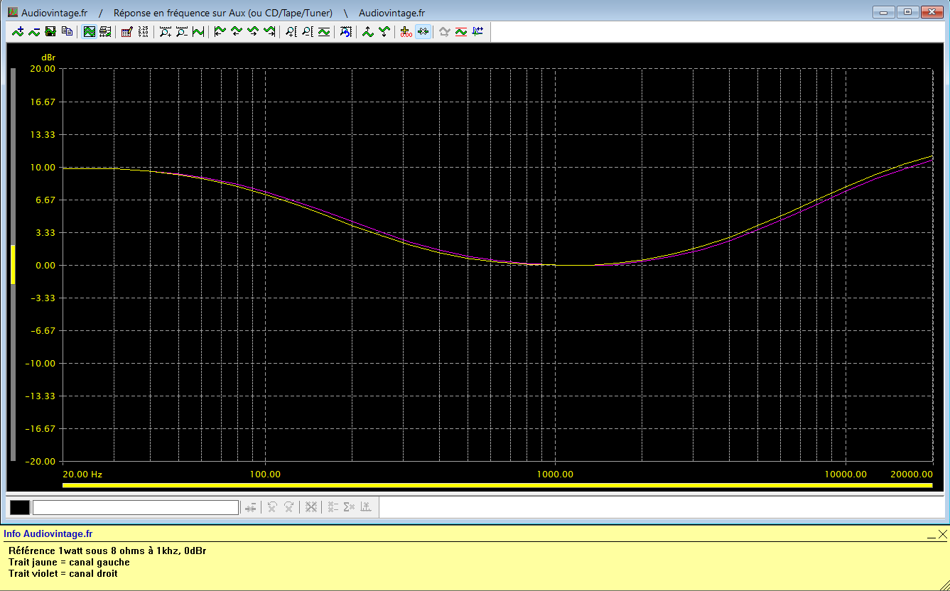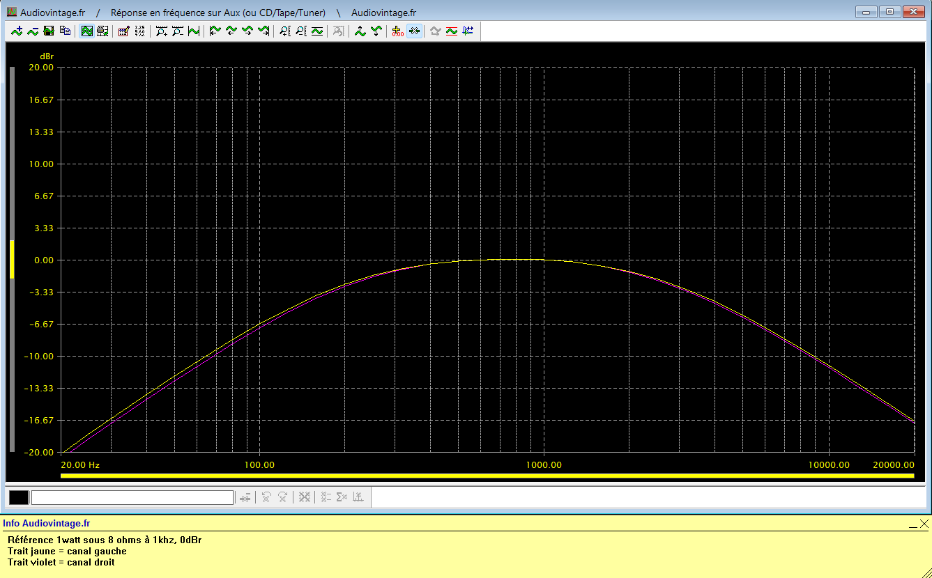 Réponse en fréquence à 2x1w sous 8 ohms, entrée aux, correcteurs de tonalité au mini puis au maxi.