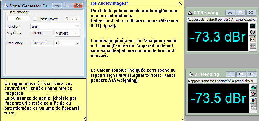 Rapport signal bruit à 2x30w sous 8 ohms, entrée phono.