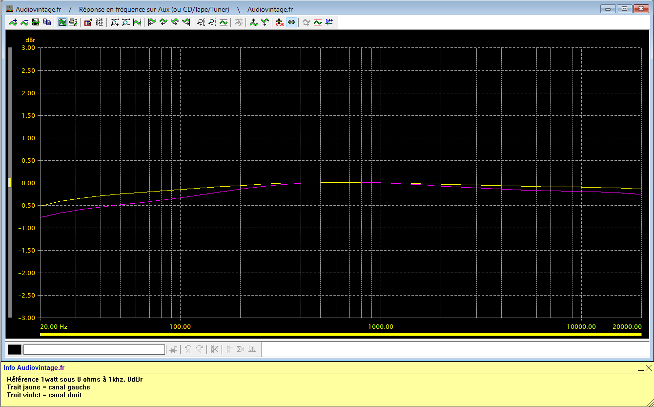 Réponse en fréquence à 2x1w sous 8 ohms, entrée aux, loudness activé.