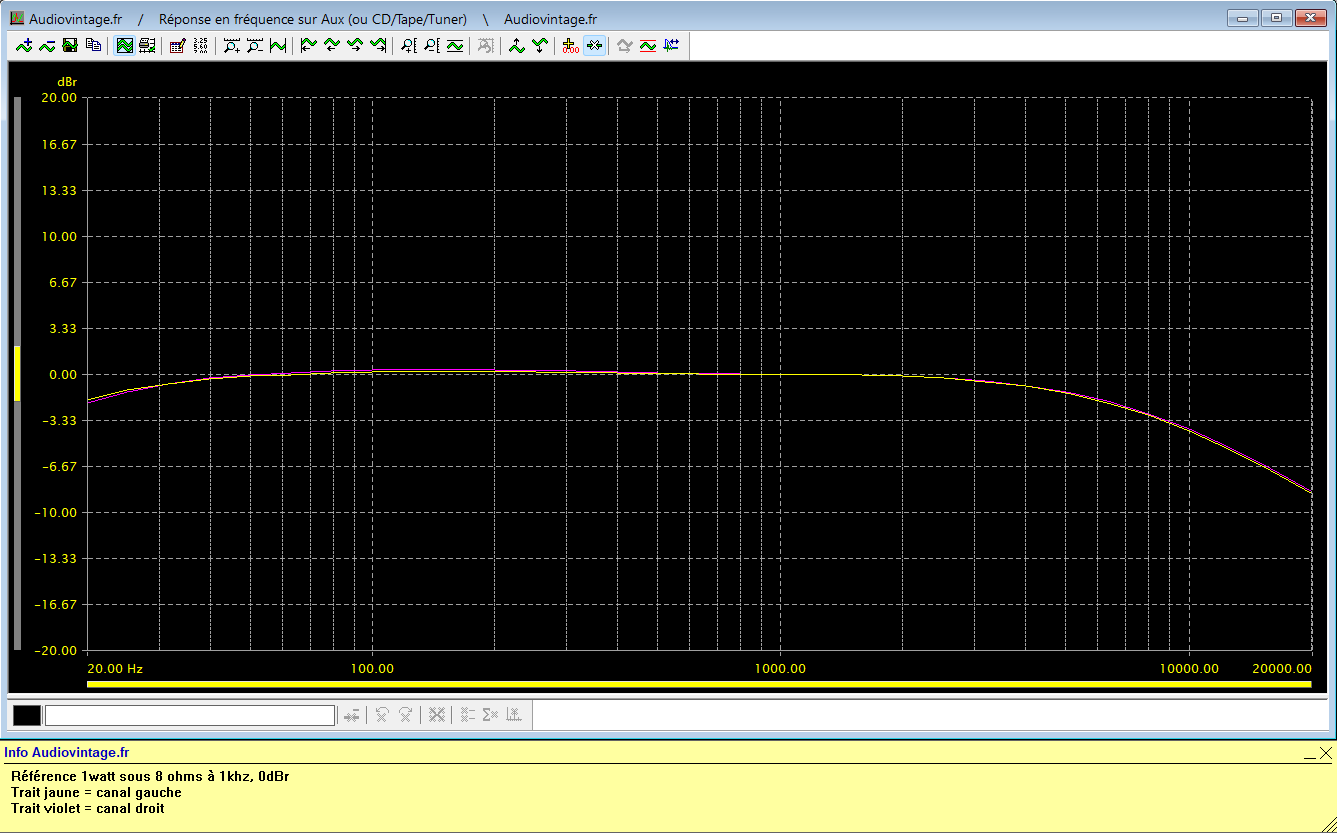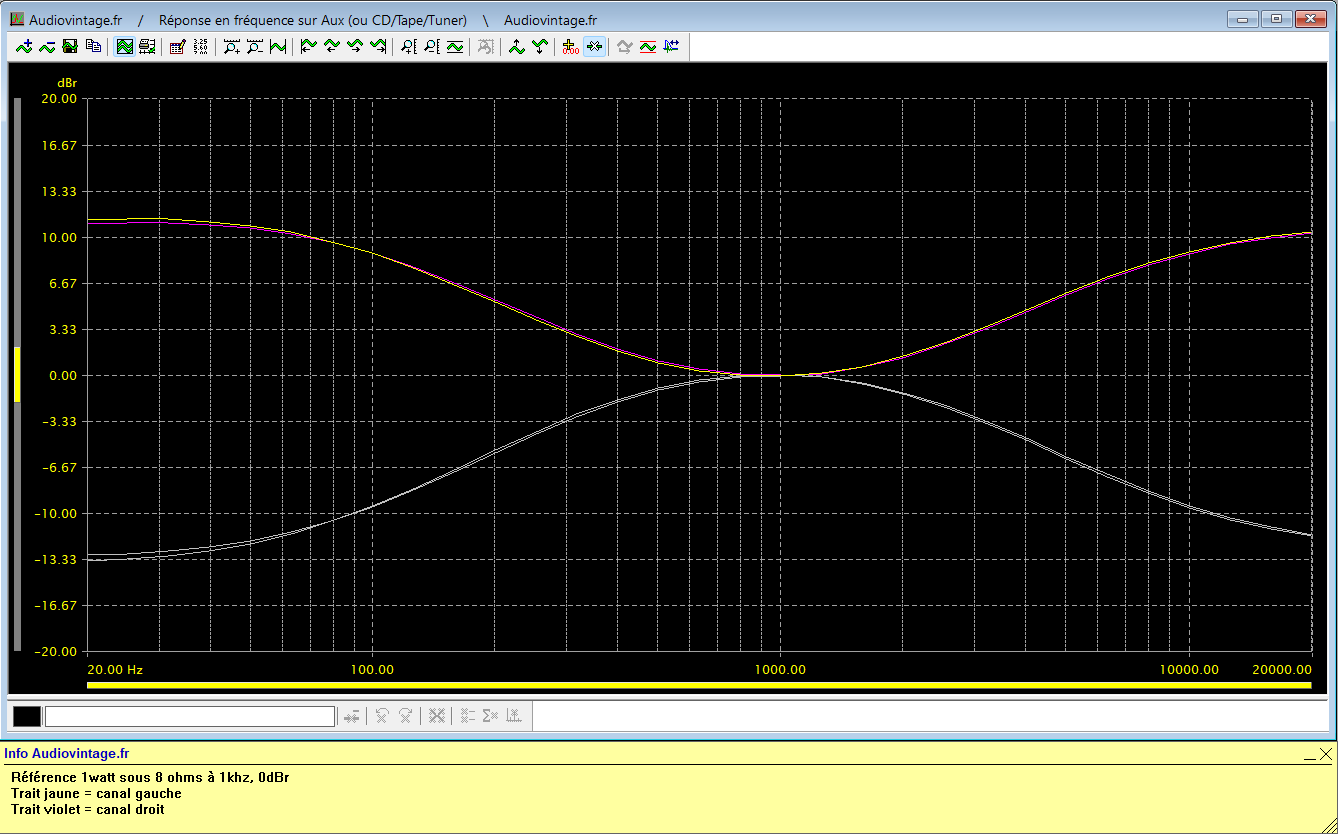 Réponse en fréquence à 2x1w sous 8 ohms, entrée aux, correcteurs de tonalité au mini puis au maxi.