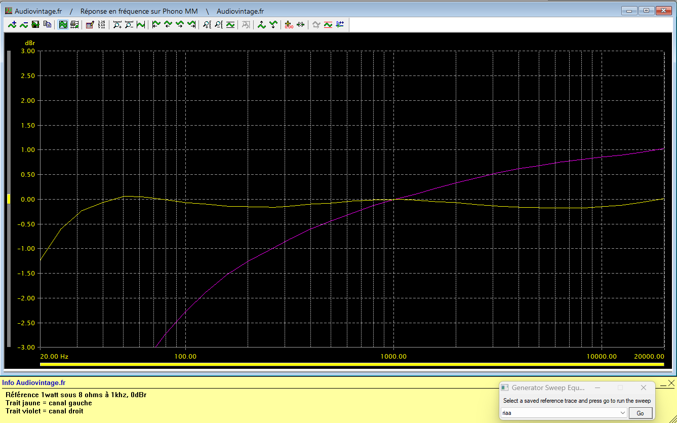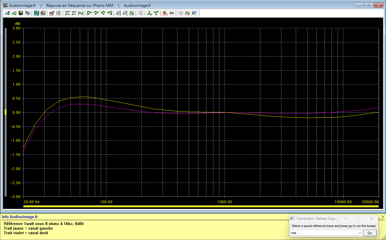réponse en fréquence à 2x1w sous 8 ohms, entrée phono. A comparer à la mesure faite avant intervention.