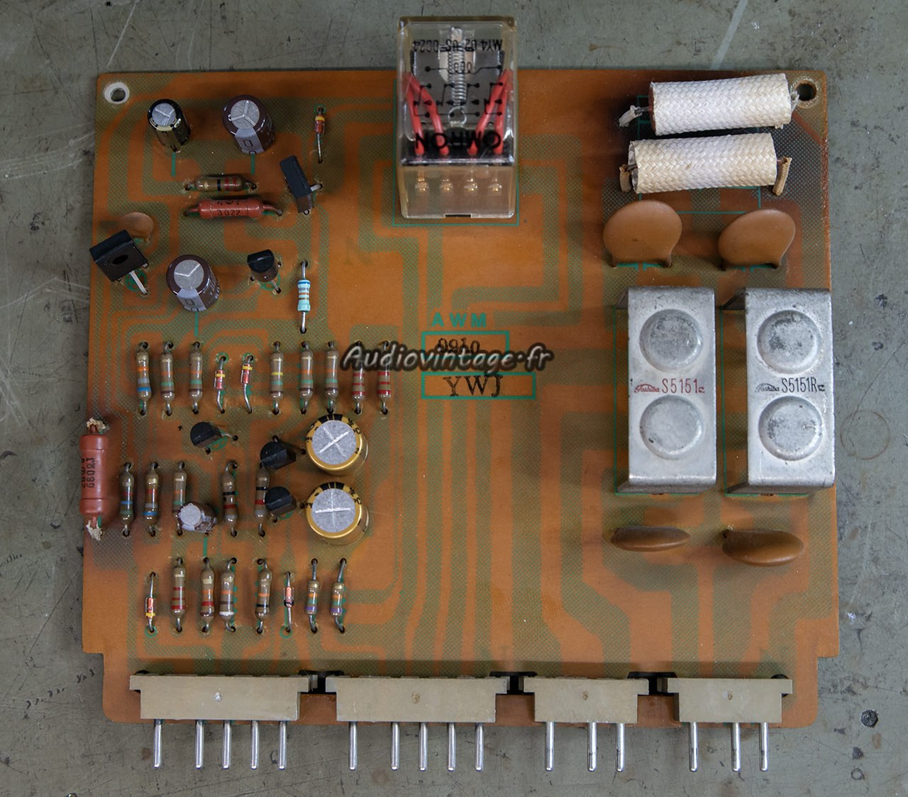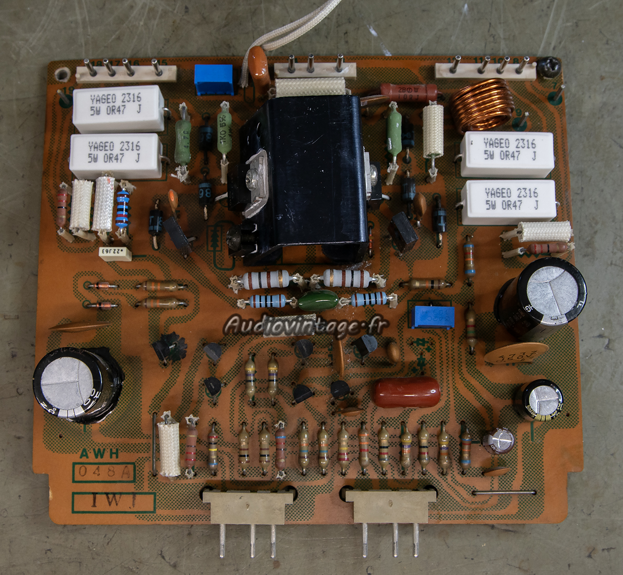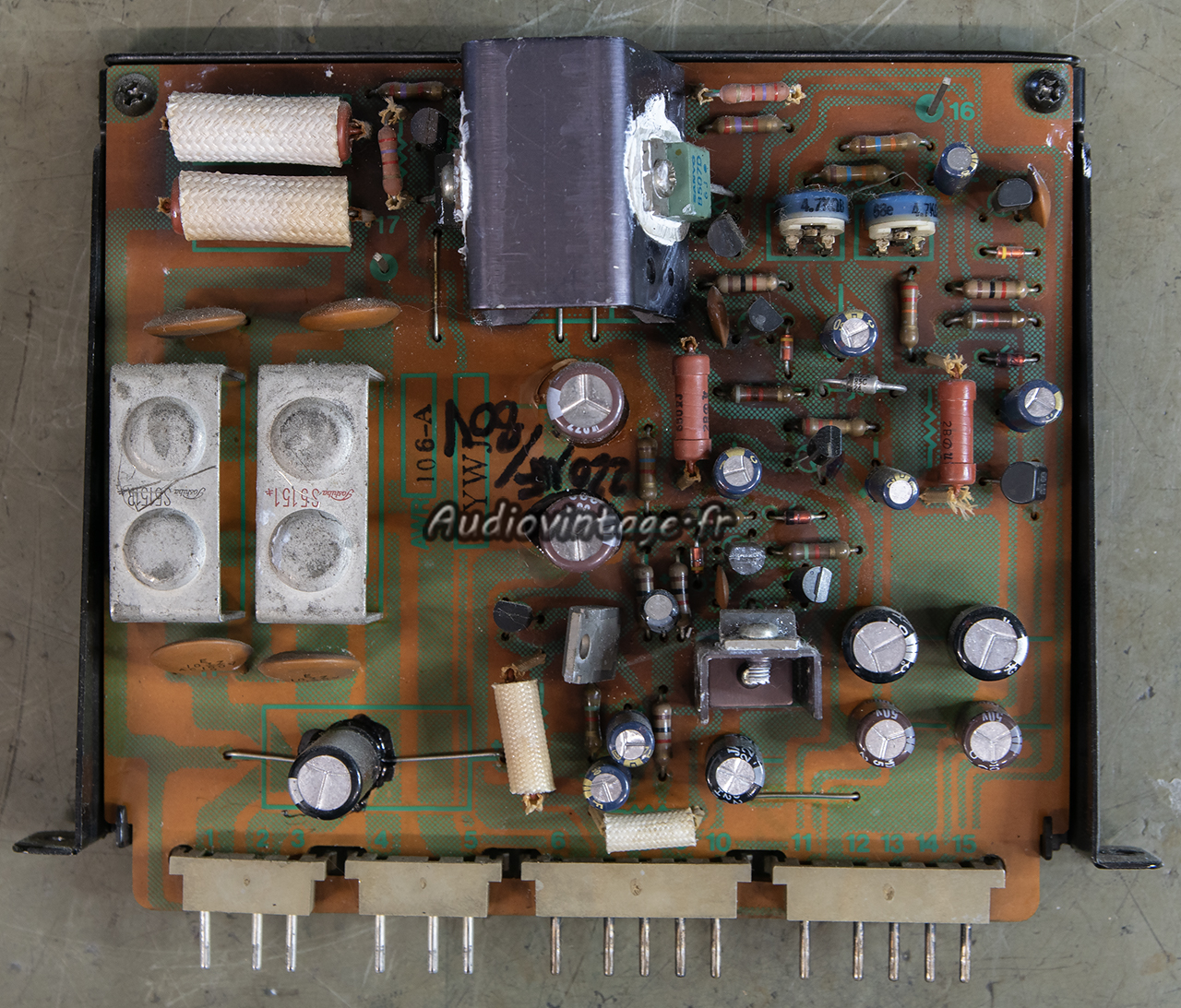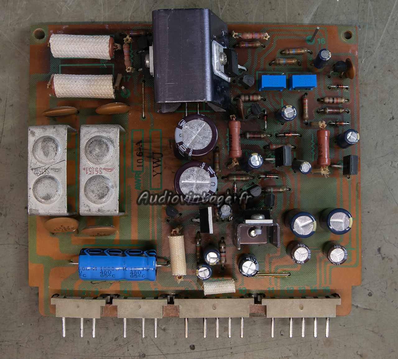 Il a déjà eu droit à un nombre inconnu de réparations, la dernière étant une intervention sur le circuit d’amplification droit (tient donc…) avec le remplacement des transistors de puissances et de nombreux composants sur le circuit driver correspondant.