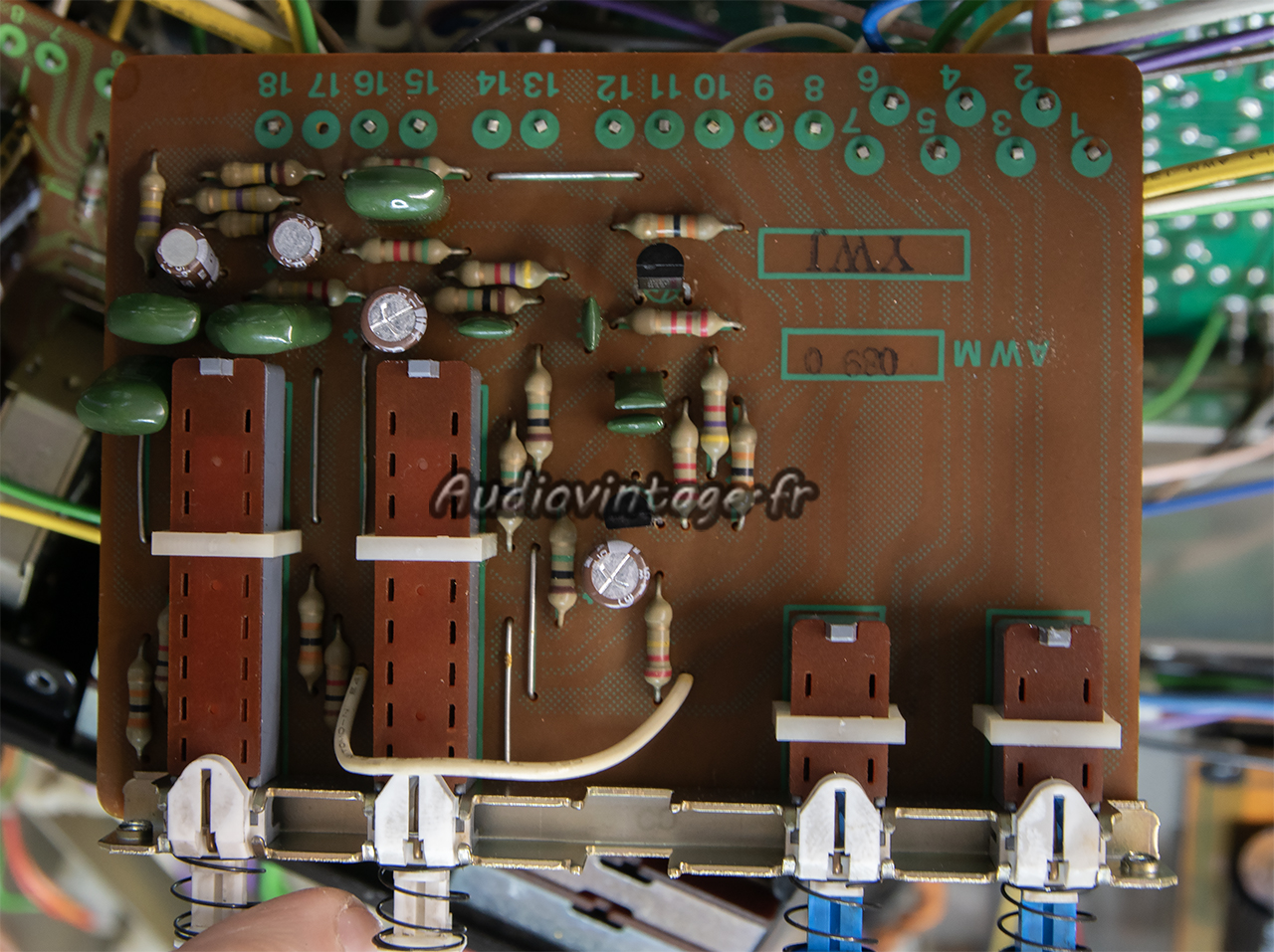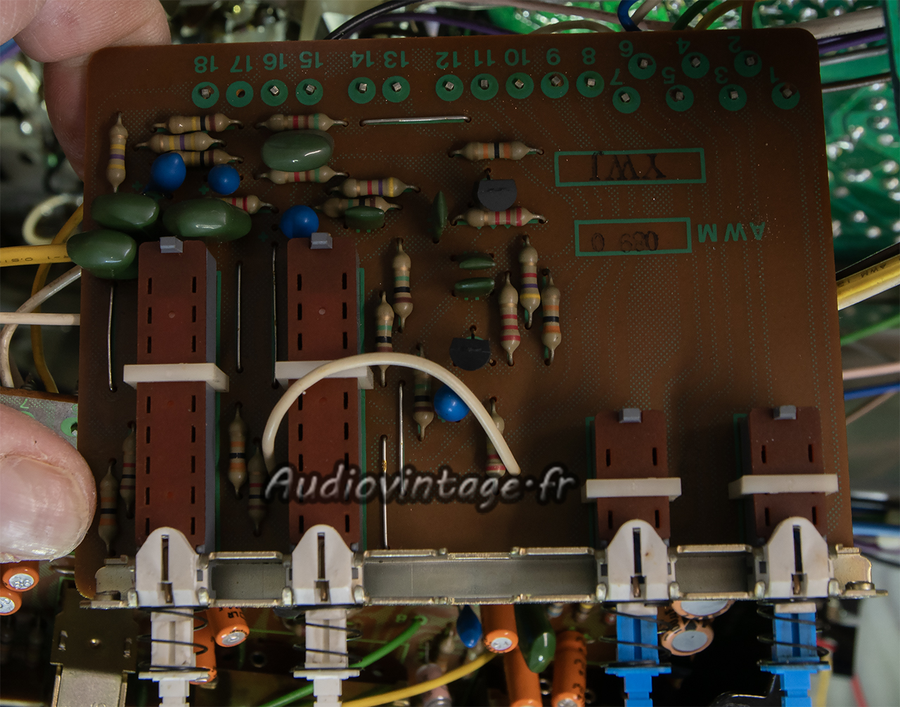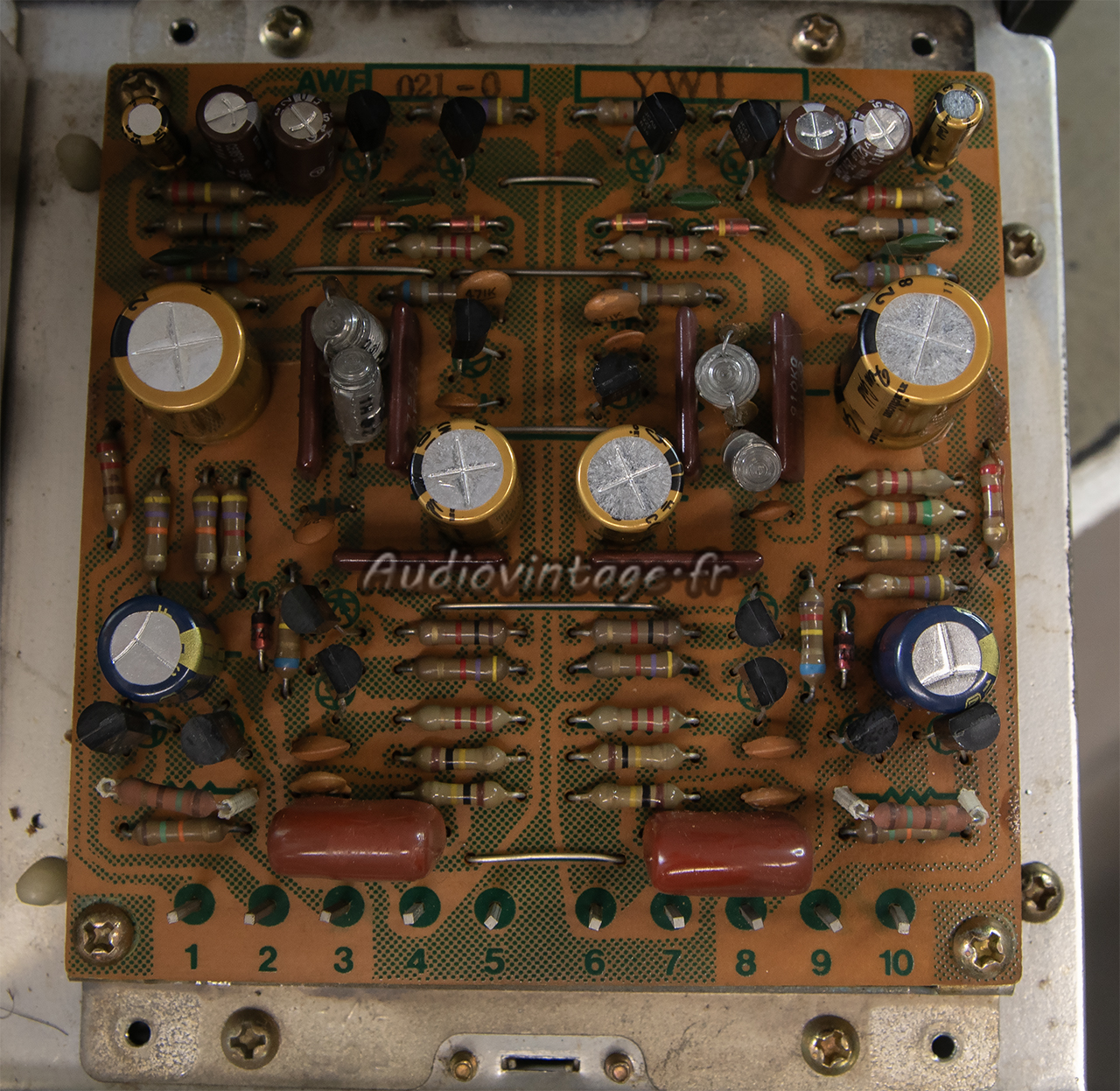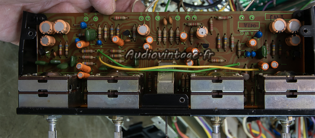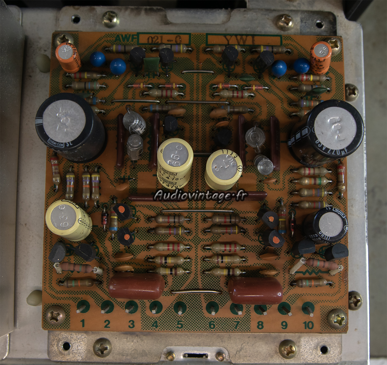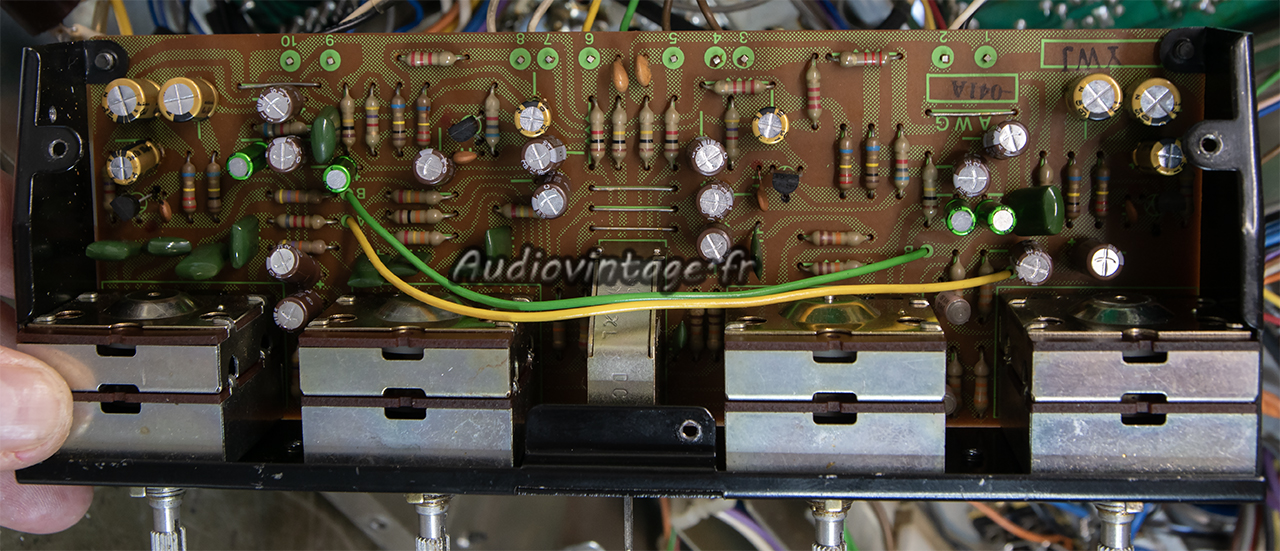 Tous les transistors et les condensateurs sont remplacés. En toute fin d’intervention, une petite modification est apportée suite au remplacement des transistors pour supprimer des oscillations parasites que j’ai constaté lors des mesures.