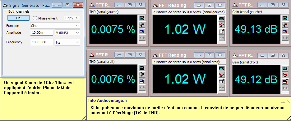 Signal carré à 100hz, 1khz, 10khz et temps de montée à 10khz. 1w en sortie sous 8 ohms, entrée aux, tone defeat.