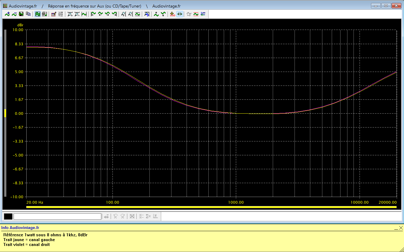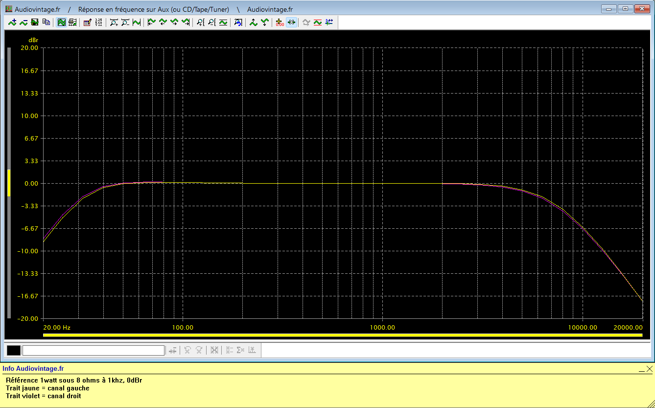 Réponse en fréquence à 2x1w sous 8 ohms, entrée phono, tone defeat.