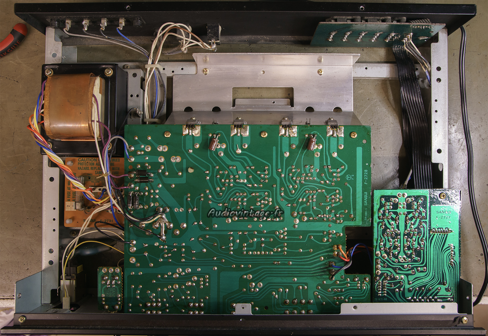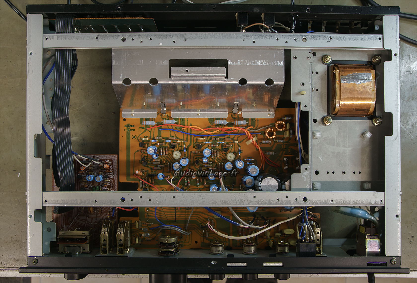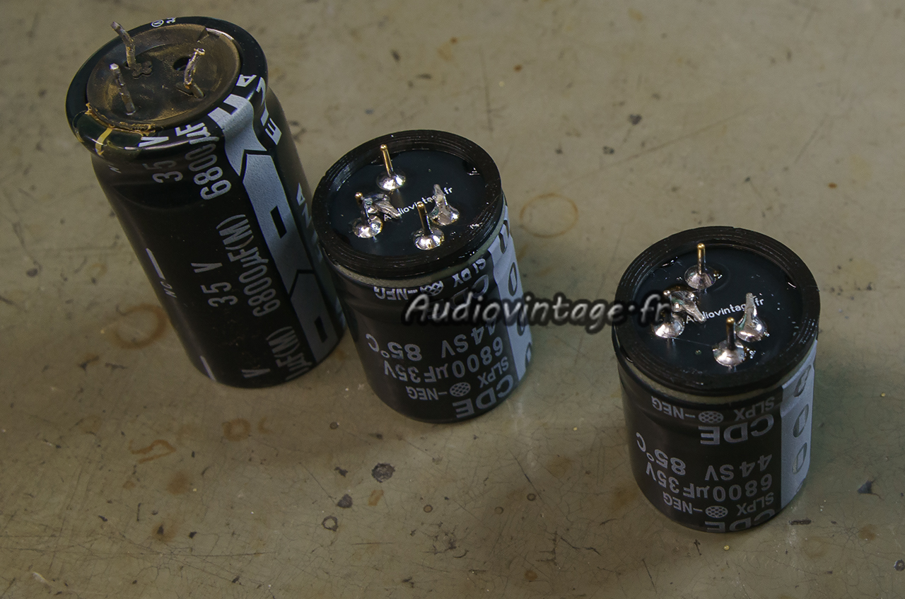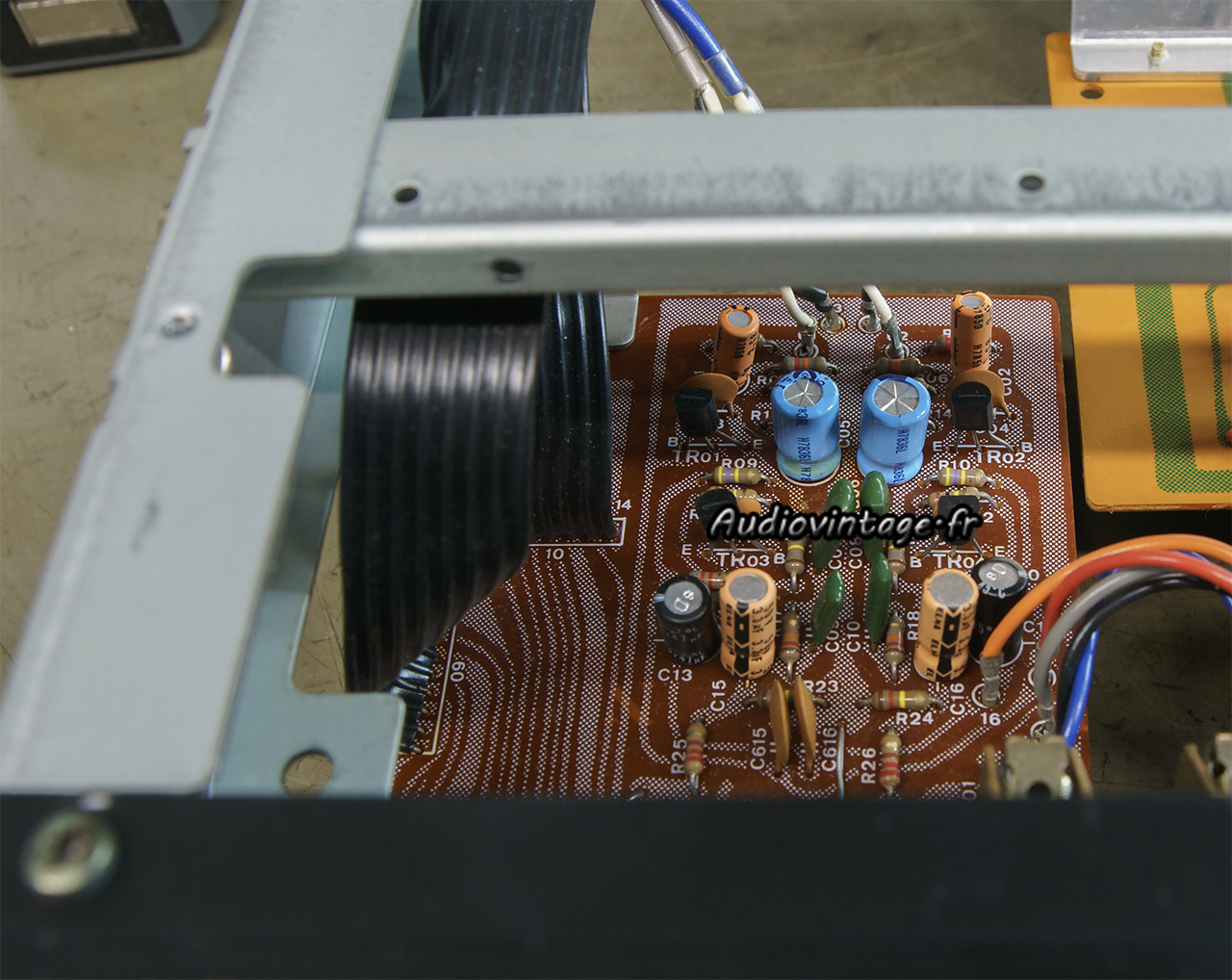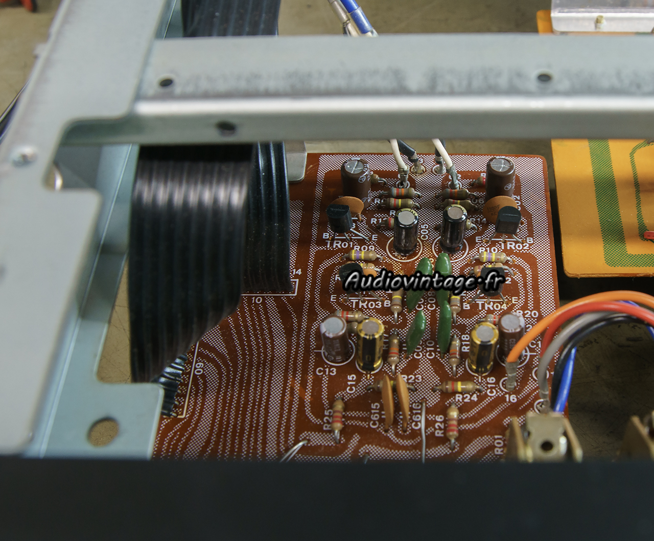 Condensateurs chimiques, résistances fusibles et certains transistors (responsables des bruits entendus sur le canal gauche) sont remplacés.