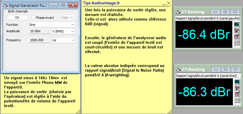 Rapport signal bruit à 2x1w sous 8 ohms, entrée phono.