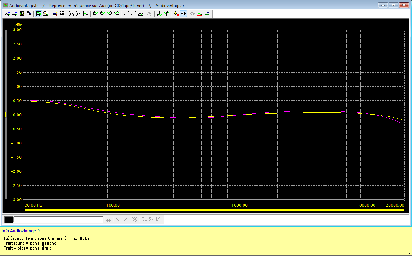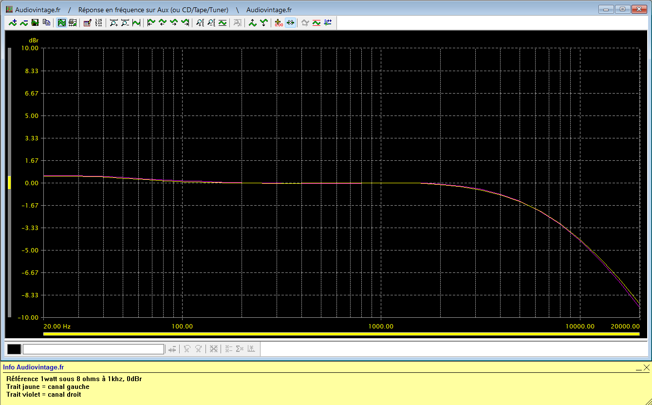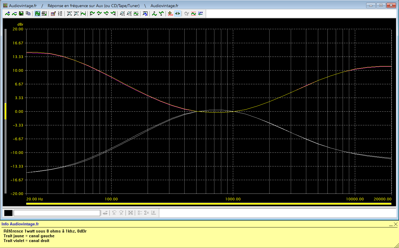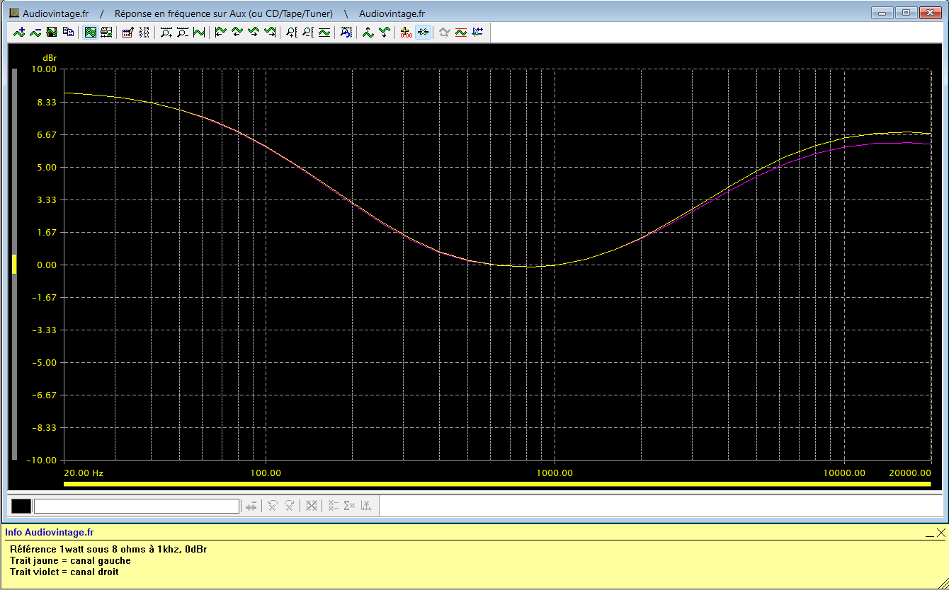 Réponse en fréquence à 2x1w sous 8 ohms, entrée aux, correcteurs de tonalité au mini puis au maxi.