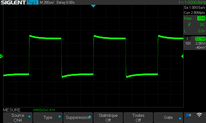 Signal carré à 100hz, 1khz, 10khz et temps de montée à 10khz. 1w en sortie sous 8 ohms, entrée aux.
