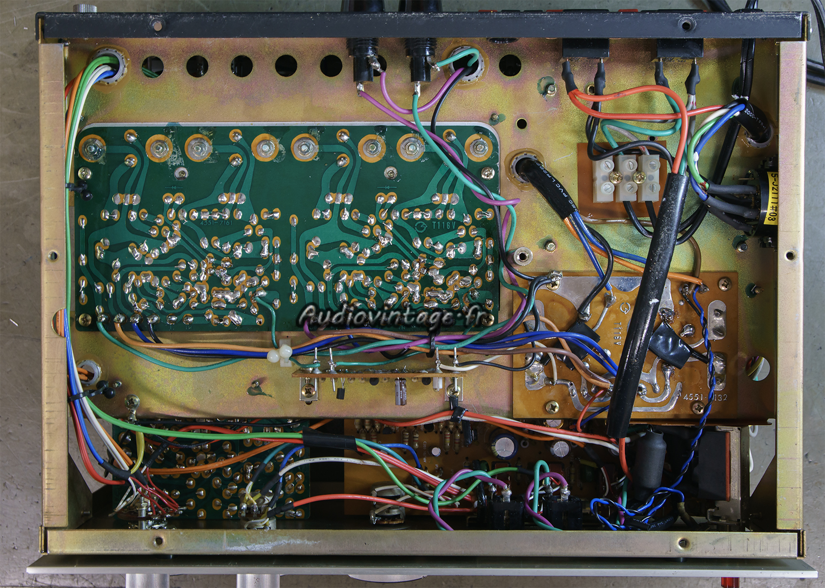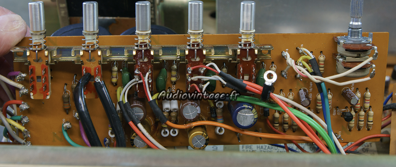 Tous les condensateurs chimiques ainsi que certains transistors sont remplacés. En fin d’intervention, je remplacerai également la résistance ajustable de courant de repos d’un des deux canaux, finalement très fatiguée.