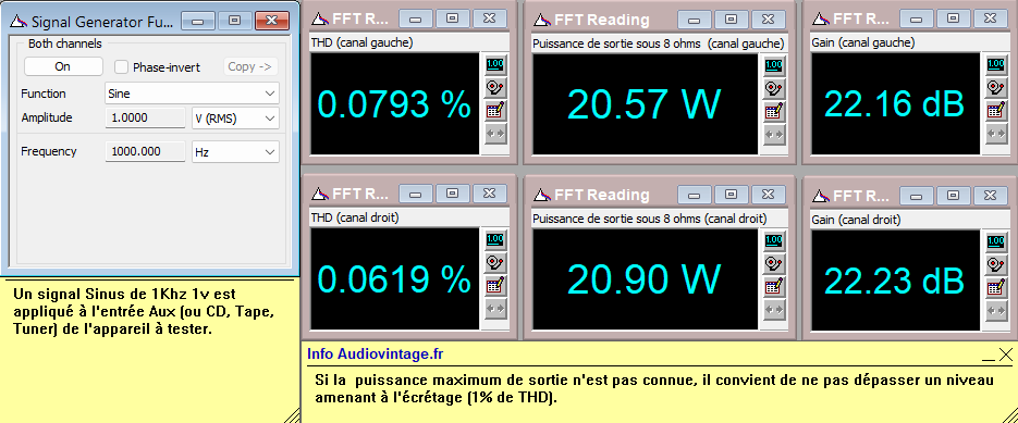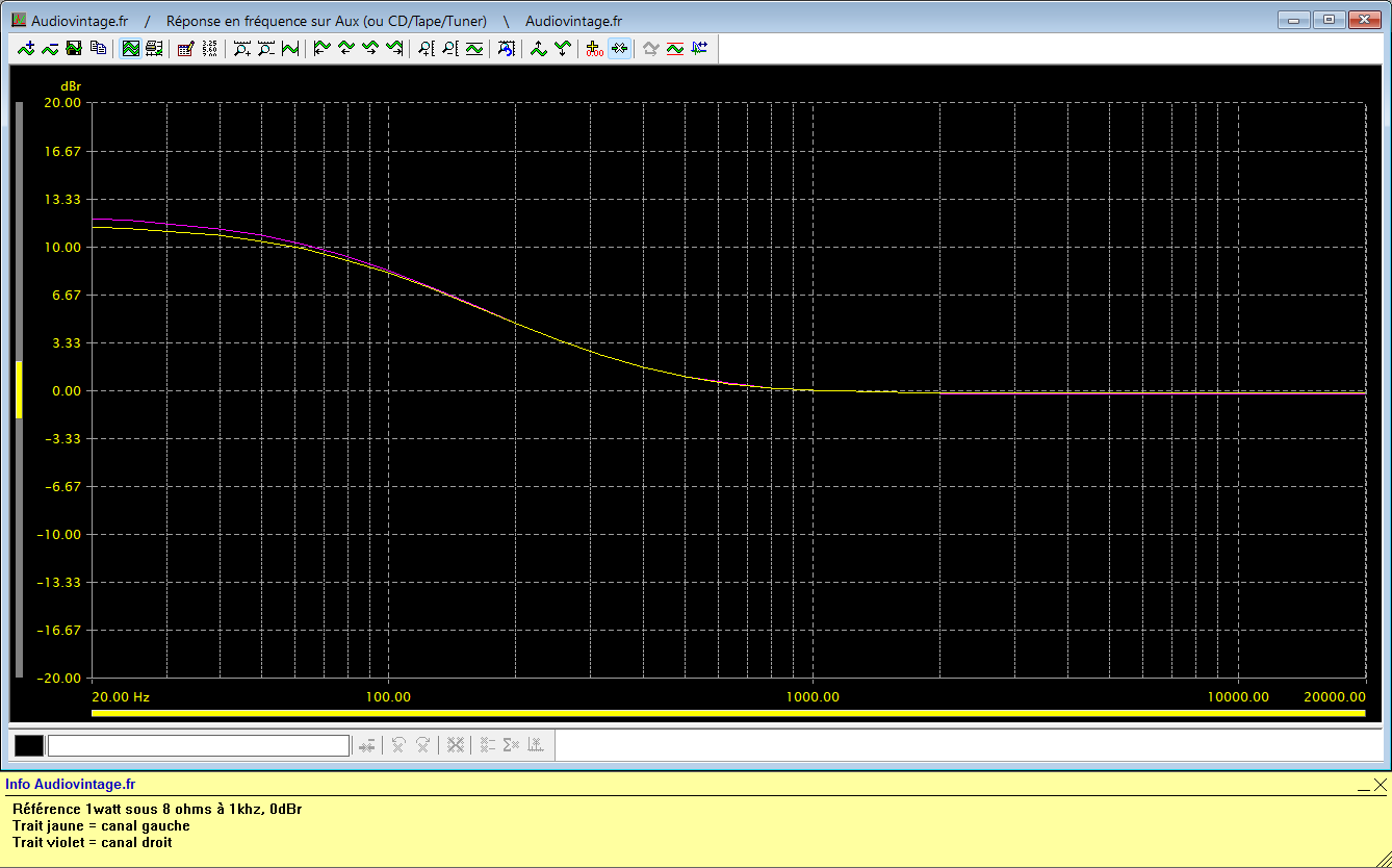 Réponse en fréquence à 2x1w sous 8 ohms, entrée aux, correcteurs de tonalité au mini puis au maxi.