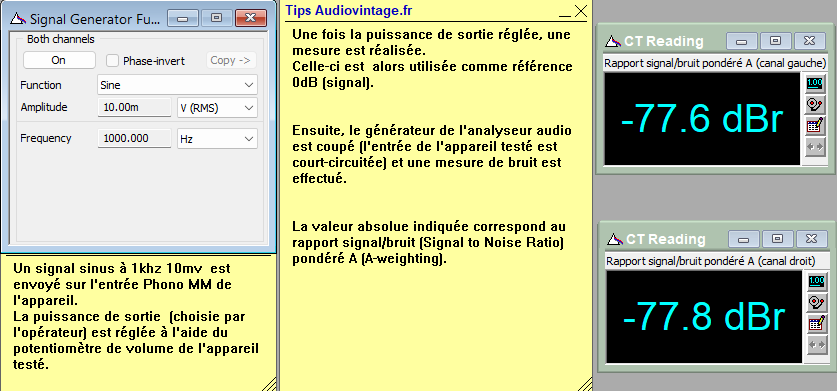Rapport signal bruit à 2x20w sous 8 ohms, entrée phono.