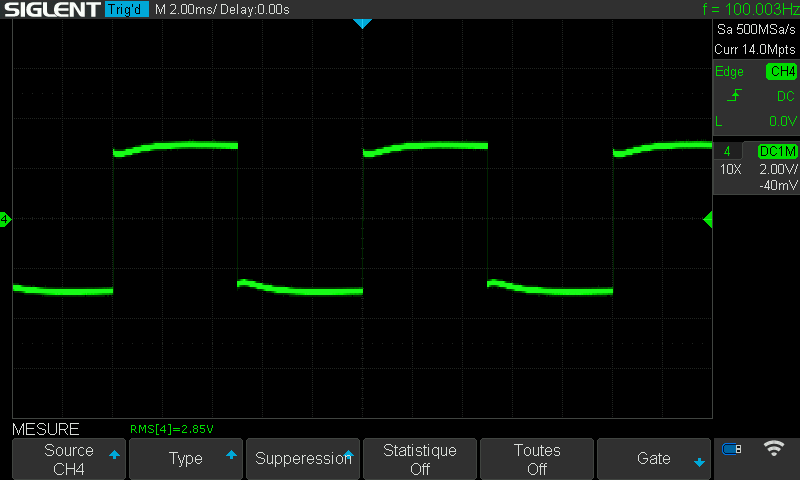 Signal carré à 100hz, 1khz, 10khz et temps de montée à 10khz. 1w en sortie sous 8 ohms, entrée aux.