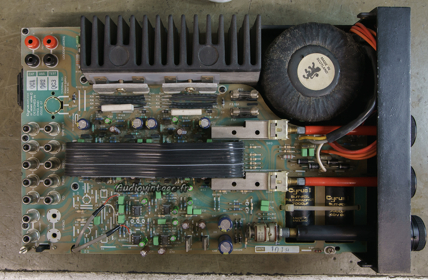 L’appareil fonctionne. Je note quelques bizarreries, le fusible secteur et un des fusibles d’alimentation ont été inversé. Il y a une ronflette importante en entrée phono sans aucune source connectée, les sélecteurs sont encrassés, et le Cyrus ne sonne pas très bien, ce qui est logique vu l’état (habituel) des condensateurs chimiques présents sur le circuit.